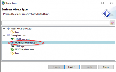 Im folgenden Menü wählen Sie „FFG Engineering Item“ aus. Bitte benutzen Sie immer nur diesen Teiletyp.