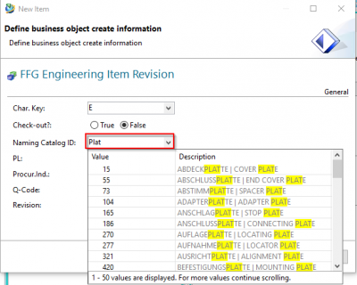 Wenn Sie in das Feld „Naming Catalog ID“ klicken und eine Eingabe machen, werden aus dem Katalog alle Einträge angezeigt, welche diesen Text in der deutschen oder englischen Benennung enthalten. Sie können hier einen passenden Namen bzw. die ID auswählen, die deutsche und englische Benennung werden anschließend beim Speichern in die Attribute an Revision und Item eingetragen.