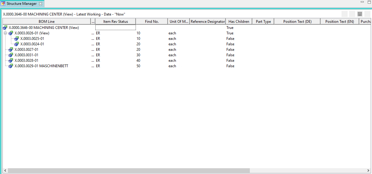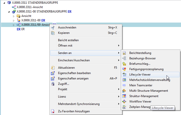 To open a structure in the Structure Manager, double-click on a “BOM View Revision” of a specific revision or select the corresponding revision and use the right mouse button to navigate to the menu item “Send To ” → “Structure Manager”.