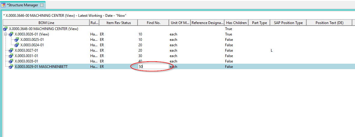 The second example shows how to edit a simple value without a value list, in this case the item number in the BOM. Here you also double-click on the column “Find No.”, then you can enter a value directly and confirm with “Enter”.