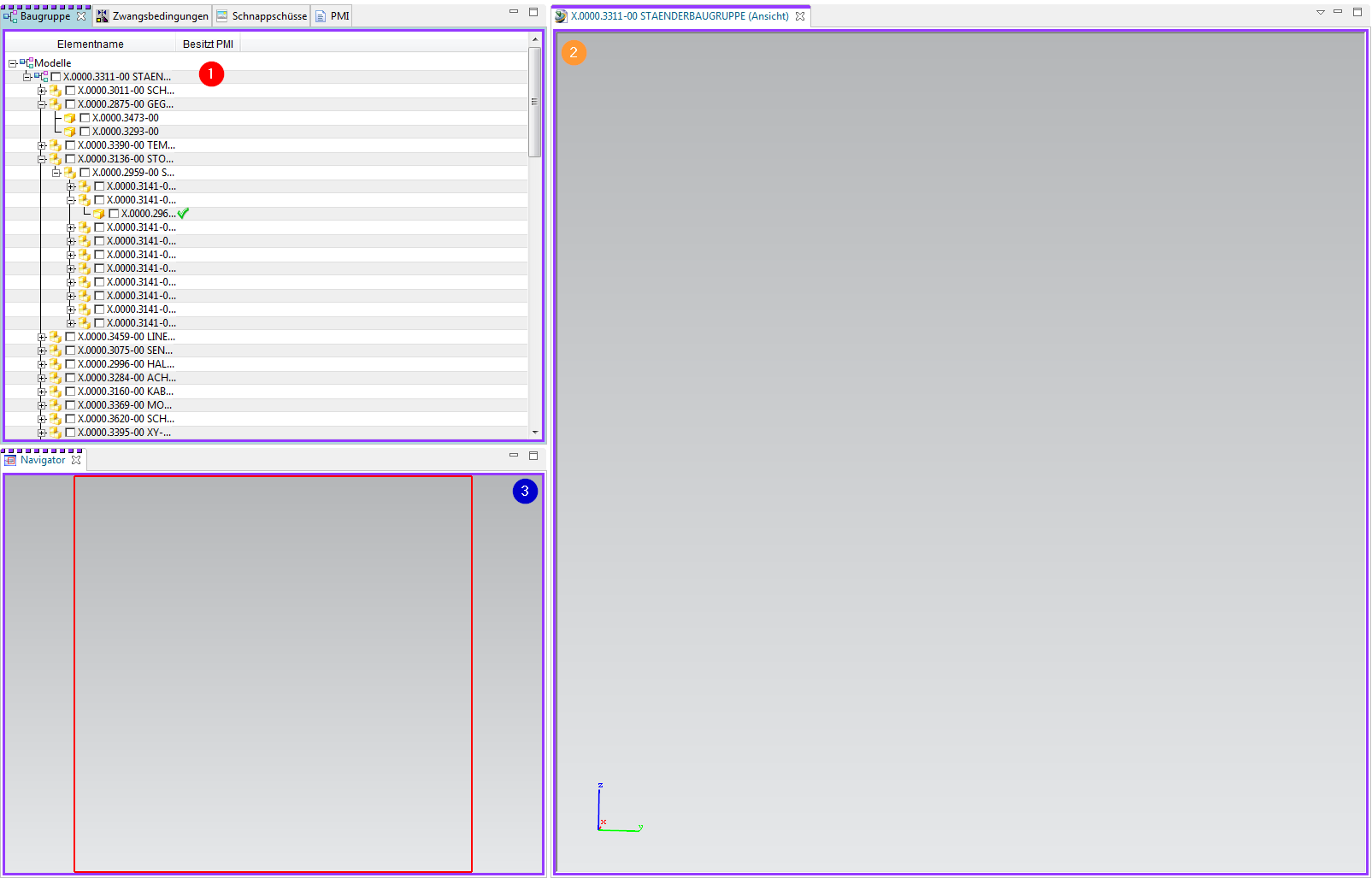 | 1. | To display a structure, subassemblies or individual parts, you must activate them by left-clicking in the field. Now all item revs that have a JT are displayed. If a field is filled in green, no JT exists for this Item Rev. |