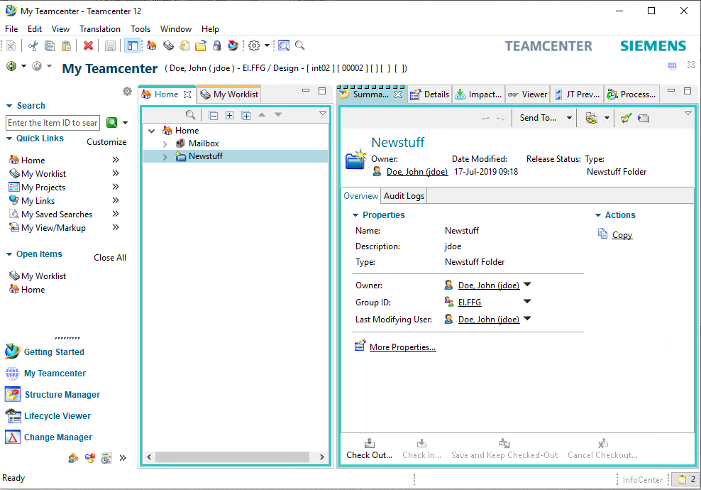 After logging in, you are in the application “My Teamcenter” or also called “Teamcenter Navigator”. There you have a “Home” folder in which you can store data in order to access it quickly.