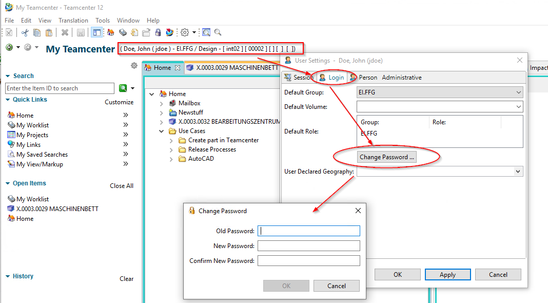 If you have logged in to Teamcenter, you should change your initial password. Click on your name in the status bar.