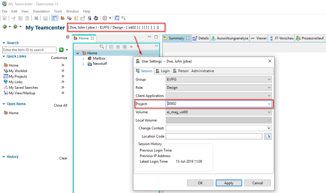 To set the project context, click on your name in the upper bar of the Teamcenter Navigator. In the following dialog you can select your current project under “Project”, in which you would like to work (“Project context”). The generated parts then receive exactly this project assignment.