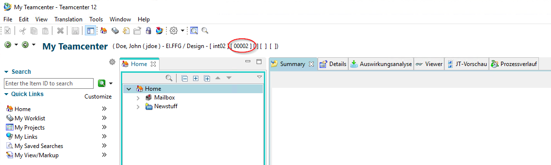 After installing Teamcenter, the shortcuts to start the client are located in the folder “c:\splmlocal\int00\appl\Shortcuts” (integration environments) or “c:\splmlocal\prod00\appl\Shortcuts” in the production environment. The client is available in English and German. There is also a shortcut for the locations Germany (DE), Hungary (HU) and USA (US), because there are local servers for the Teamcenter and NX configurations.