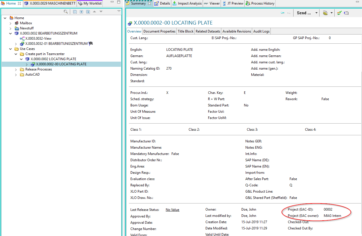 Teamcenter is configured at FFG so that parts can only be created in a “project context”. During the migration, the “EAC” data is migrated as a Teamcenter project, i.e. there are the projects “00002 (MAG-Intern”), etc. Each user is assigned to one or more projects, the parts then receive this project assignment, which in turn controls the visibility of the parts.