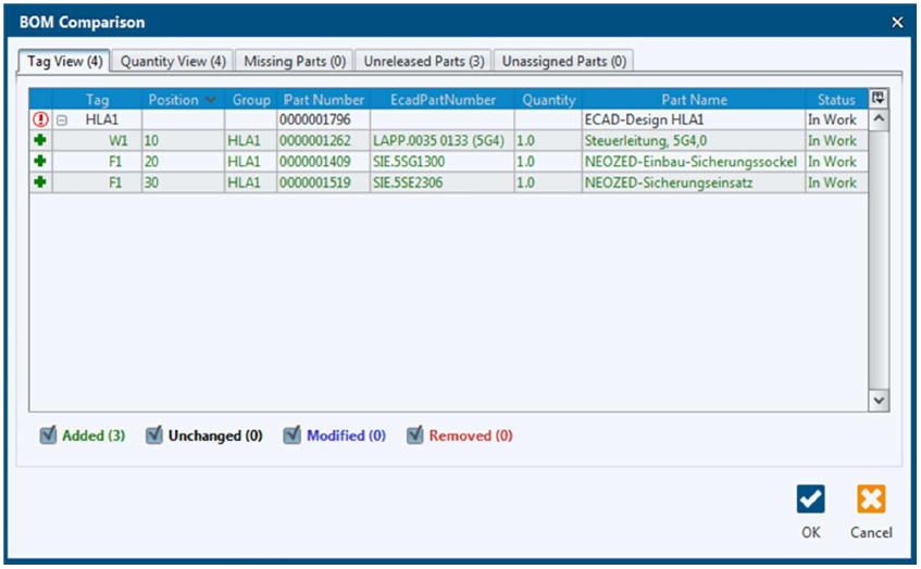 | Tag View: | Displays the compared parts lists with focus on the individual tags in the project. |