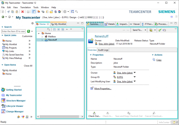 A bejelentkezés után a „My Teamcenter“ vagy a „Teamcenter Navigator“ alkalmazásban van. Van egy „Otthoni“ mappája, amelyben adatokat tárolhat, így gyorsan hozzáférhet hozzájuk.