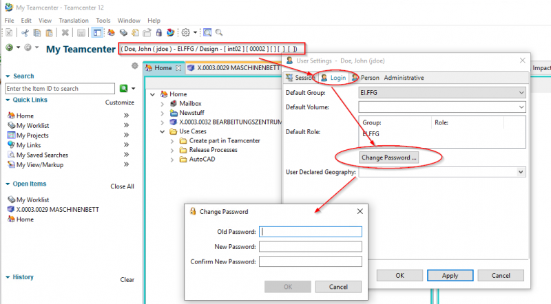 Ha bejelentkezett a Teamcenterbe, meg kell változtatnia a kezdeti jelszavát. Ehhez kattintson a nevükre az állapotsorban.