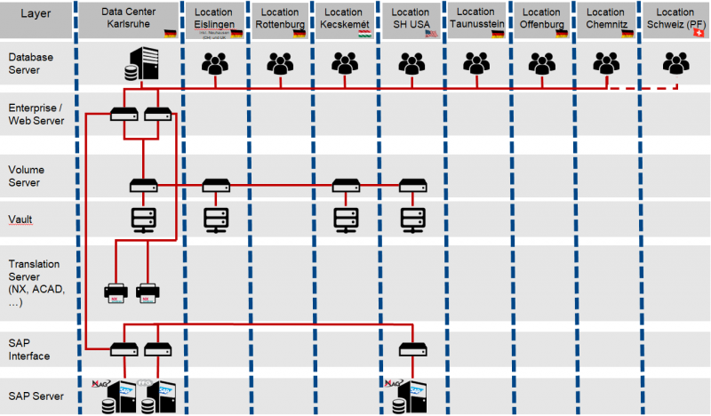 Az összes Teamcenter szerver központilag a Karlsruhe adatközpontban található.