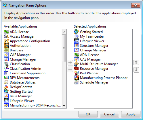 | 4 | Navigationsfenster | Navigationsfenster bietet schnellen Zugriff auf Ihre häufig verwendeten Daten. Sie können zusätzlich zur Suche, Organisation und Zugriff auf Daten die Anzeige in Teamcenter sowie Symbole im Navigationsfenster konfigurieren, um nur die Perspektiven anzuzeigen, die Sie regelmäßig für die Ausführung von Aufgaben verwenden. Klicken Sie auf die Schaltfläche zur Neuordnung über dem Feld Suche, um das Dialogfeld Reihenfolge im Navigationsbereich aufzurufen, in welchem Sie Bereiche in der Navigationsfenster ausblenden oder die Reihenfolge der Bereiche ändern können. |