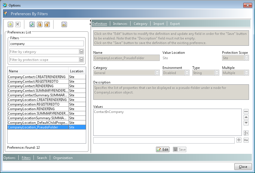 | STANDARDWERTE | Keine. Diese Voreinstellung muss manuell in die Datenbank eingetragen werden. Nehmen Sie neue Voreinstellungen im Dialogfenster Optionen vor. Sie erreichen es über das Menü Bearbeiten im Rich Client. |
