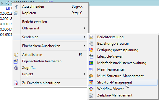Sie können die Revisionen sowohl im „Teamcenter Navigator“ als auch im „Struktur Manager“ auswählen. Wir werden in diesem Beispiel die Auswahl im „Struktur Manager“ vornehmen.