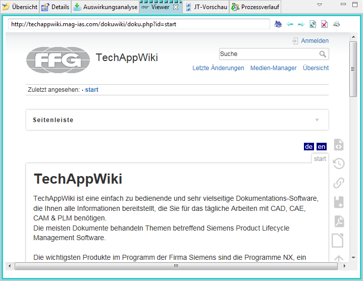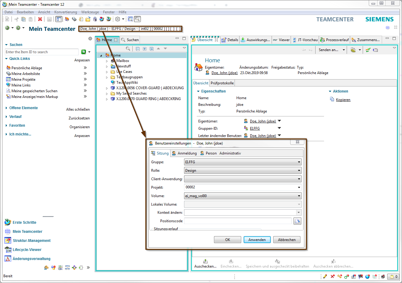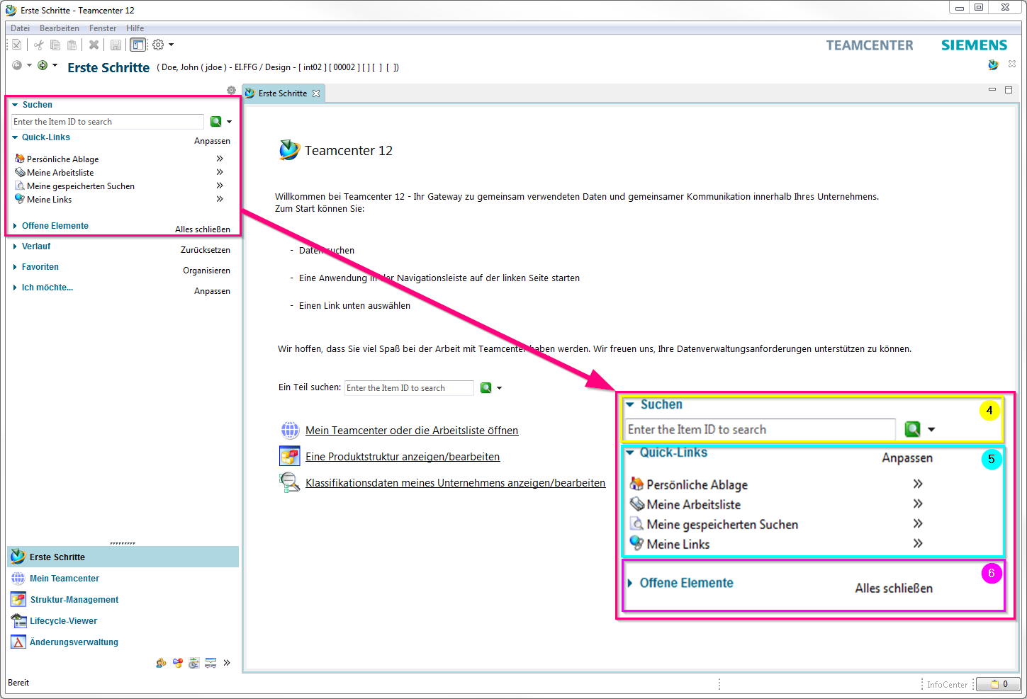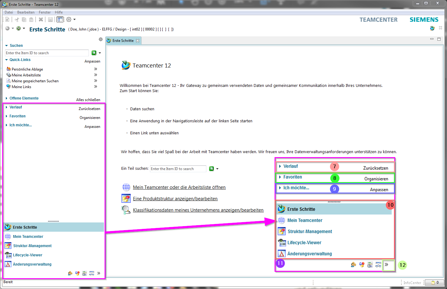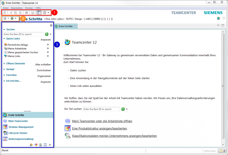 Die Anwendungsperspektive „Mein Teamcenter“ ist der Arbeitsbereich zum Nutzen und Verwalten der Produktinformationen (Artikel, Dokumente, Stücklisten, Spezifikationen, Anforderungen…).