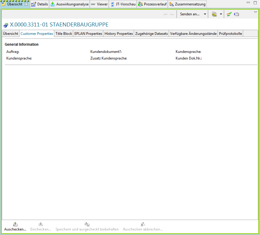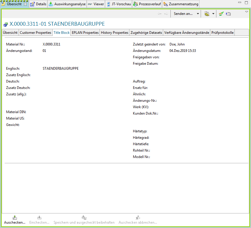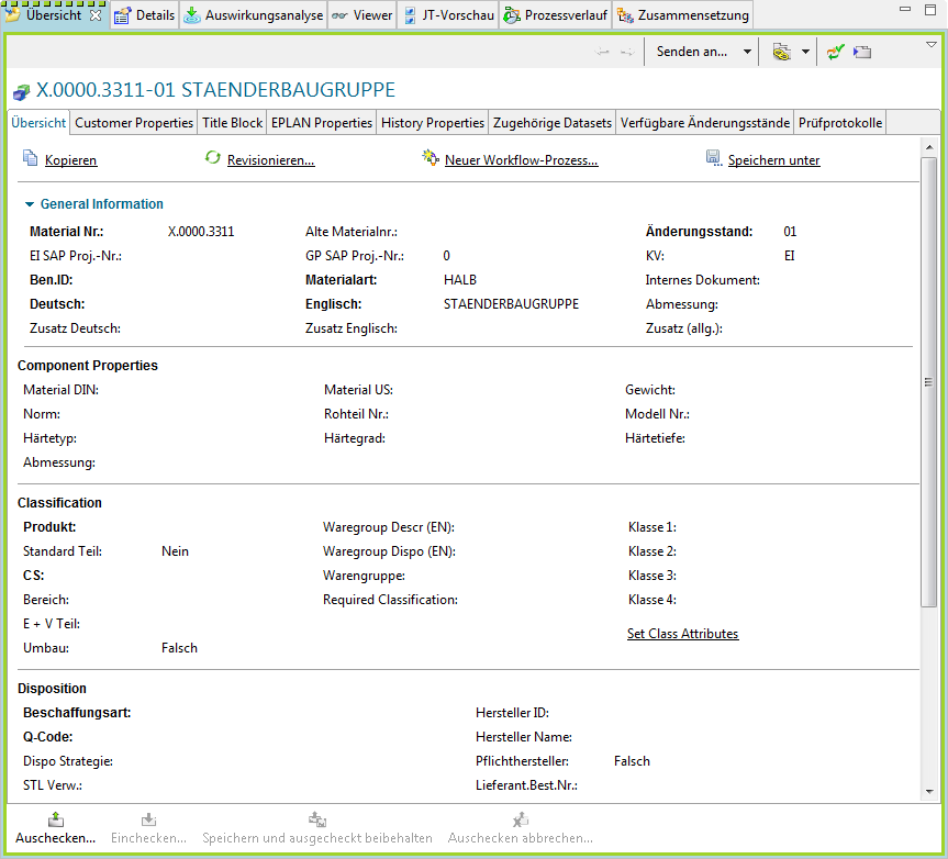 In der Registerkarte „Übersicht“ werden alle bearbeitbaren Metadaten einer Item-Revision angezeigt. Die hervorgehobenen Metadaten sind Pflichtattribute und müssen vor Freigabe nach „ER“ [Engineering Release] ausgefüllt werden.