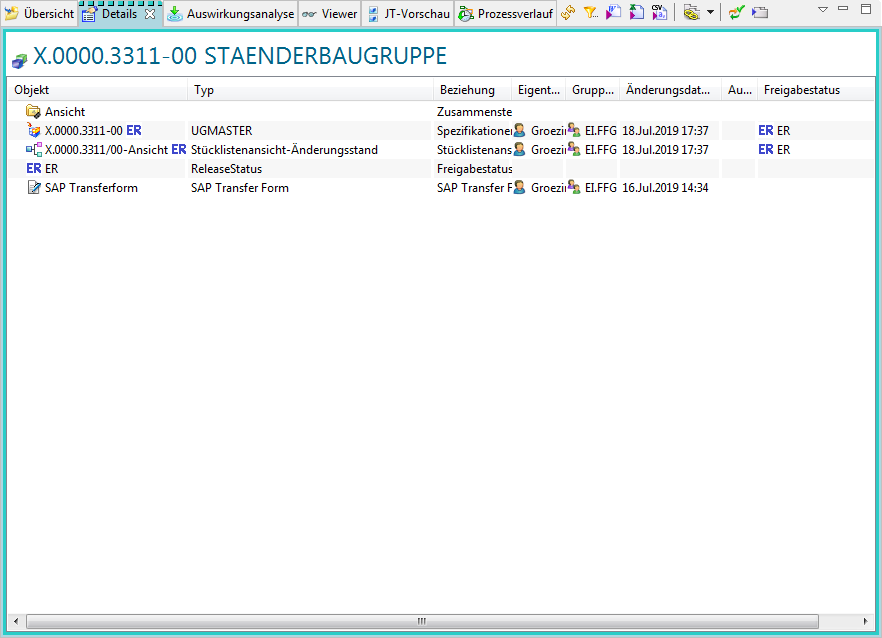 Die Ansicht Details ist eine tabellarische Anzeige der Eigenschaften der untergeordneten Elemente (Datasets, Stücklistenansicht-Änderungsstand, Status, SAP Transferform..) des derzeit in der Komponentenansicht ausgewählten Objekts.