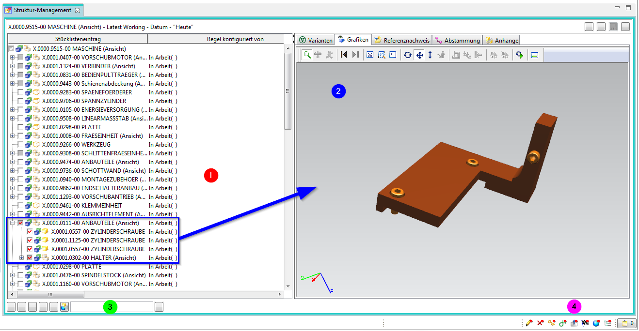 Der Struktur Manager ermöglicht es Ihnen allgemeine Produktstrukturen (BOM = Bill of Material) zu erstellen, die so konfiguriert werden können, dass die Produktstruktur zu einer bestimmten Zeit oder für eine bestimmte Einheit dargestellt werden kann, wie beispielsweise: