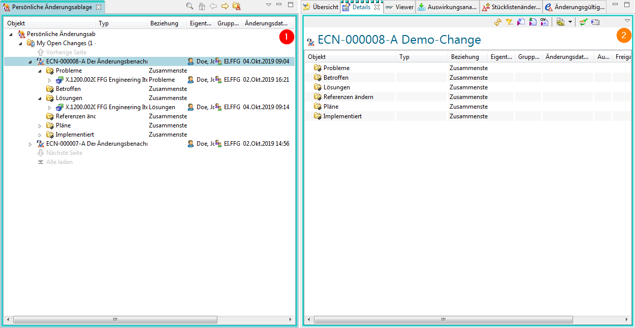 | 2. | Die Perspektive Änderungsverwaltung enthält Ansichten zum Anzeigen von Änderungseigenschaften, verknüpften Elementen, Stücklistenänderungen, Änderungsgültigkeit und Arbeitseinteilungsaufgaben. |